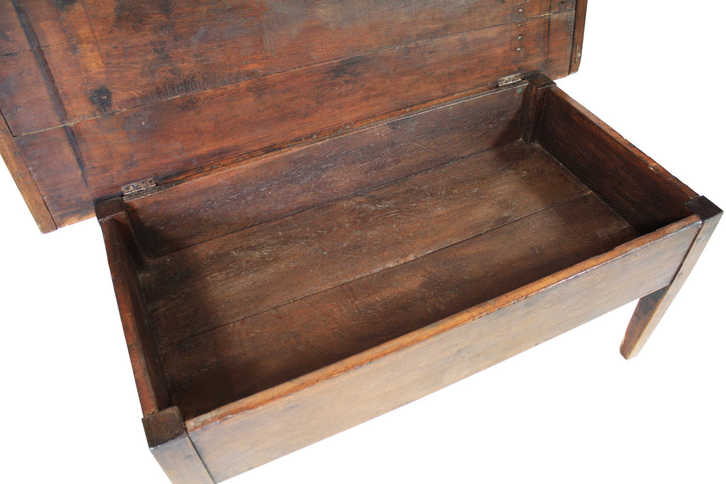 Rustic oak coffee table w/ clean lines and a lid that opens to reveal extra storage space.